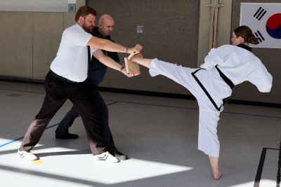 Hier versuchten die Teilnehmer mit diversen Fußtechniken Bretter bis zu